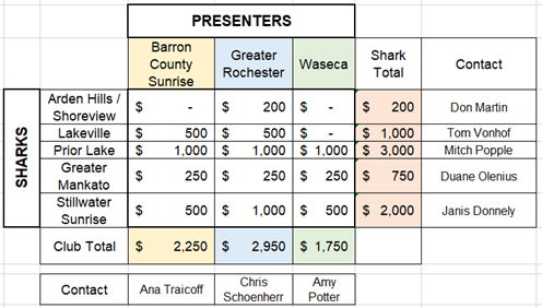The district grant team did a great job of organizing and executing the event. The event even had ‘celebrity appeal’ with Ed Boeve, the current District Governor and our own Glenn Bowers, the incoming District Governor, in attendance. Frank Mabley from our club also participated as an observer. I learned that if we are going to participate in the future, we should have the ability to commit at least $1,000 to the participating clubs. As you can see from the table above, other clubs provided $750, $1,000, $2,000 and $3,000 each, compared to our $200.
